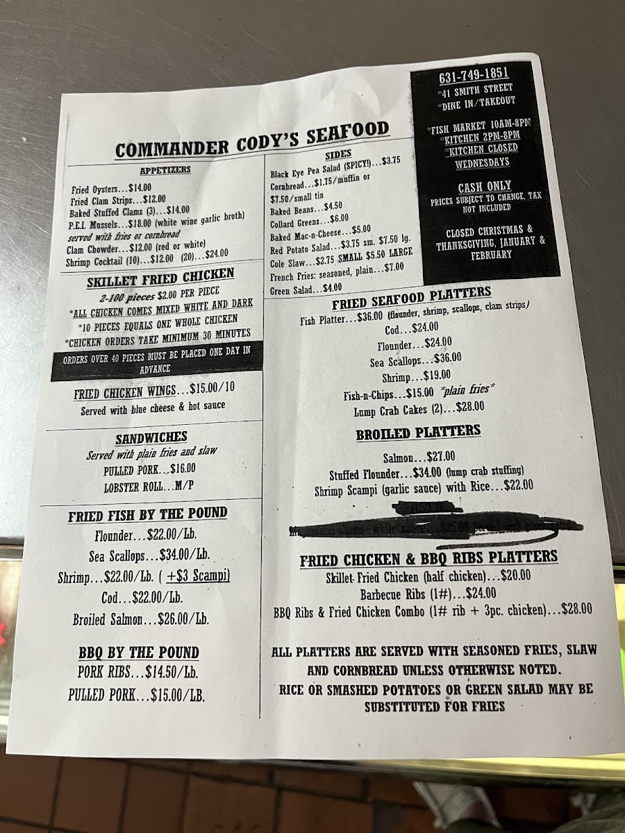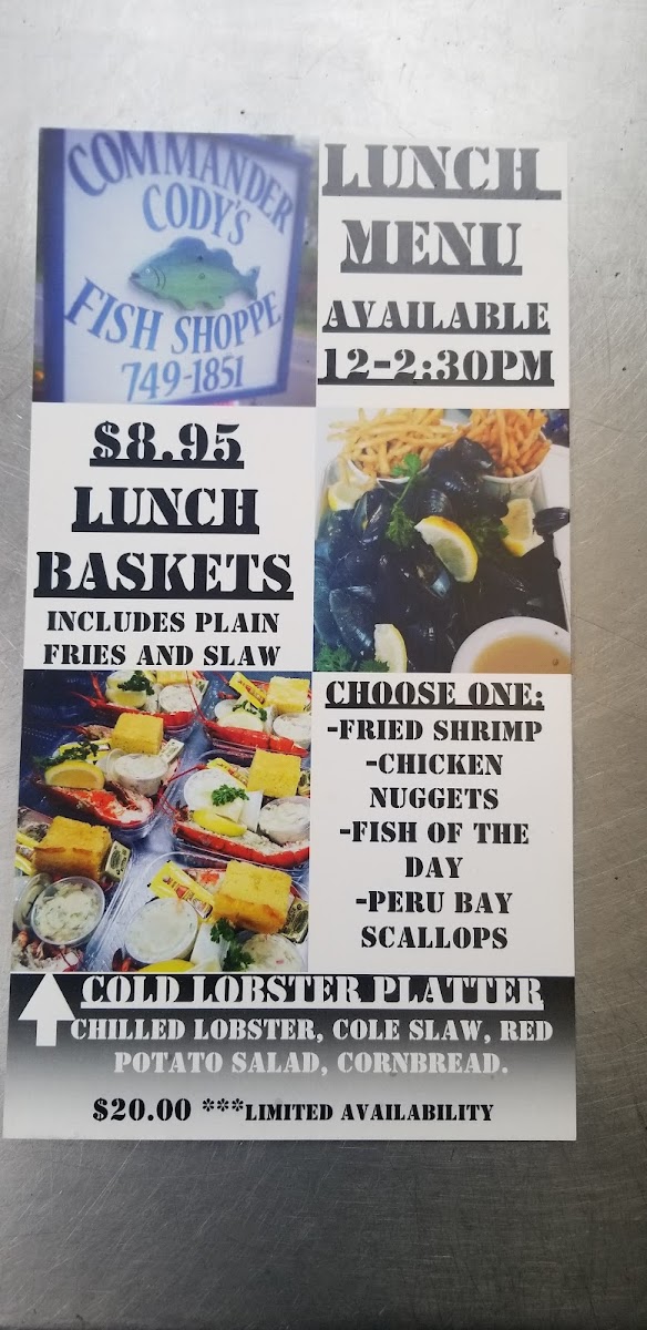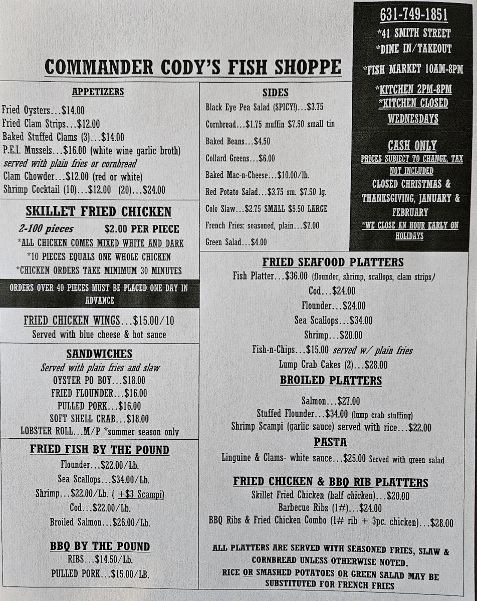 Commander Cody's Fish Shoppe offers a straightforward, no-frills menu centered around fresh, thoughtfully prepared seafood. The selection reflects a market-style approach with takeout convenience, focusing on dishes that feel at home whether you’re grabbing a quick, satisfying lunch or packing a casual dinner to enjoy by the water.